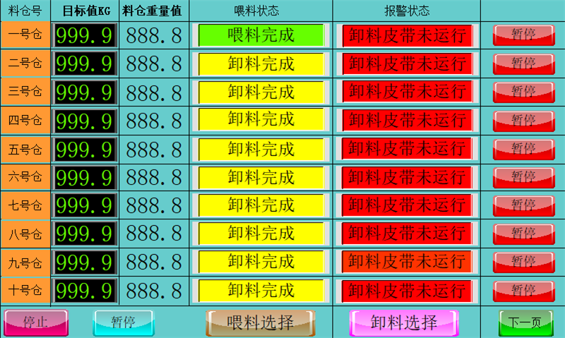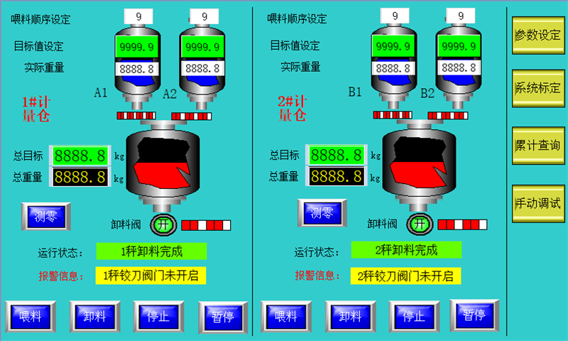 設(shè)置多個獨立儲料倉和多個獨立計量倉,對每種需要計量的物料預先按照各自配方進行喂料控制(分為高速喂料和低速喂料、提前量控制)進入計量倉內(nèi),等待生產(chǎn)需要時可以直接同步進行卸料。